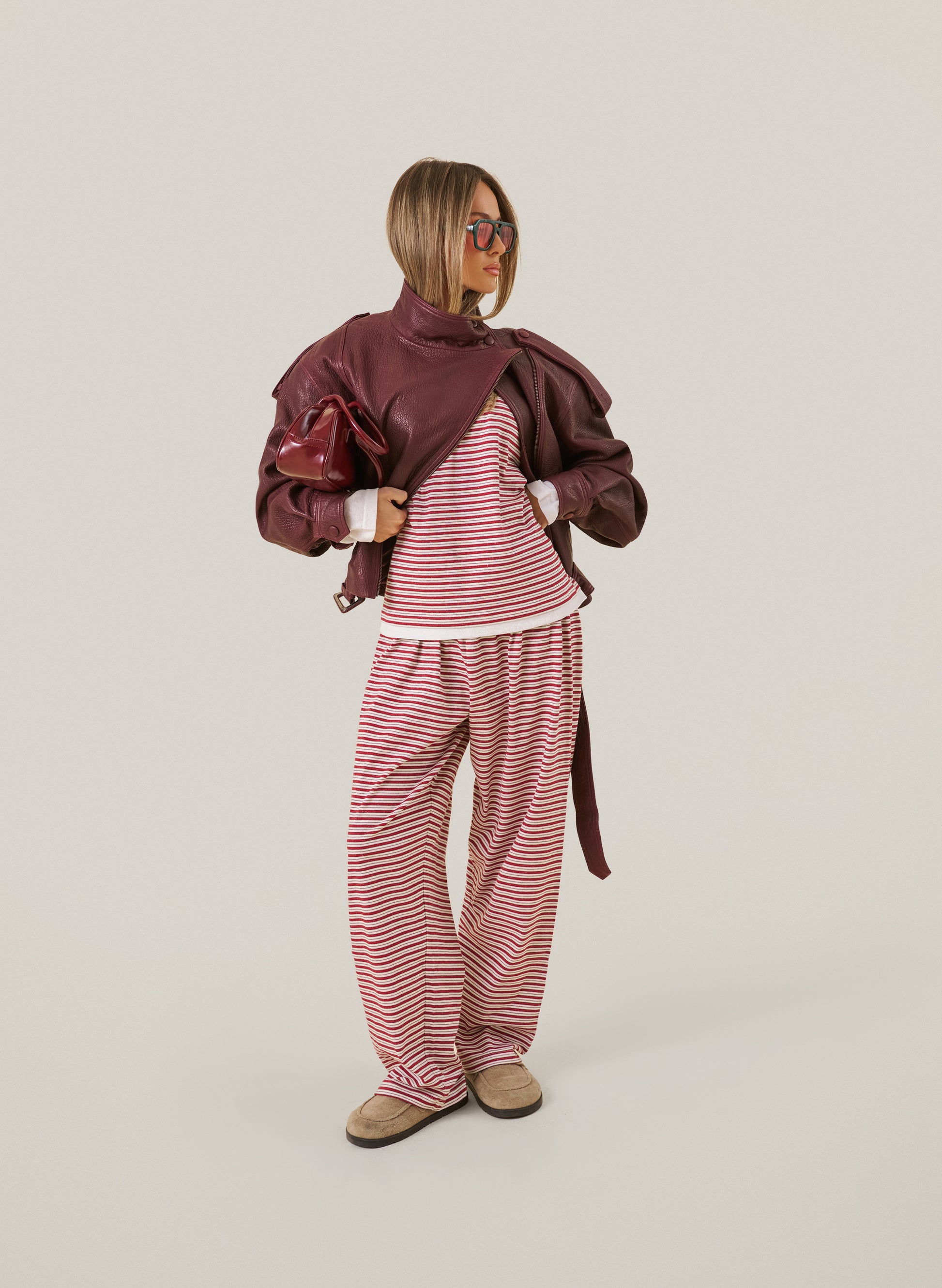 With its signature red-and-cream stripe and easy, loose fit, it’s the set you’ll reach for on repeat. Lounging overtime, Boxing Day strolls, and pretending you didn’t just sleep in it. Wear it solo, layer it up, or style it with a jacket and loafers for the ultimate lounge look.