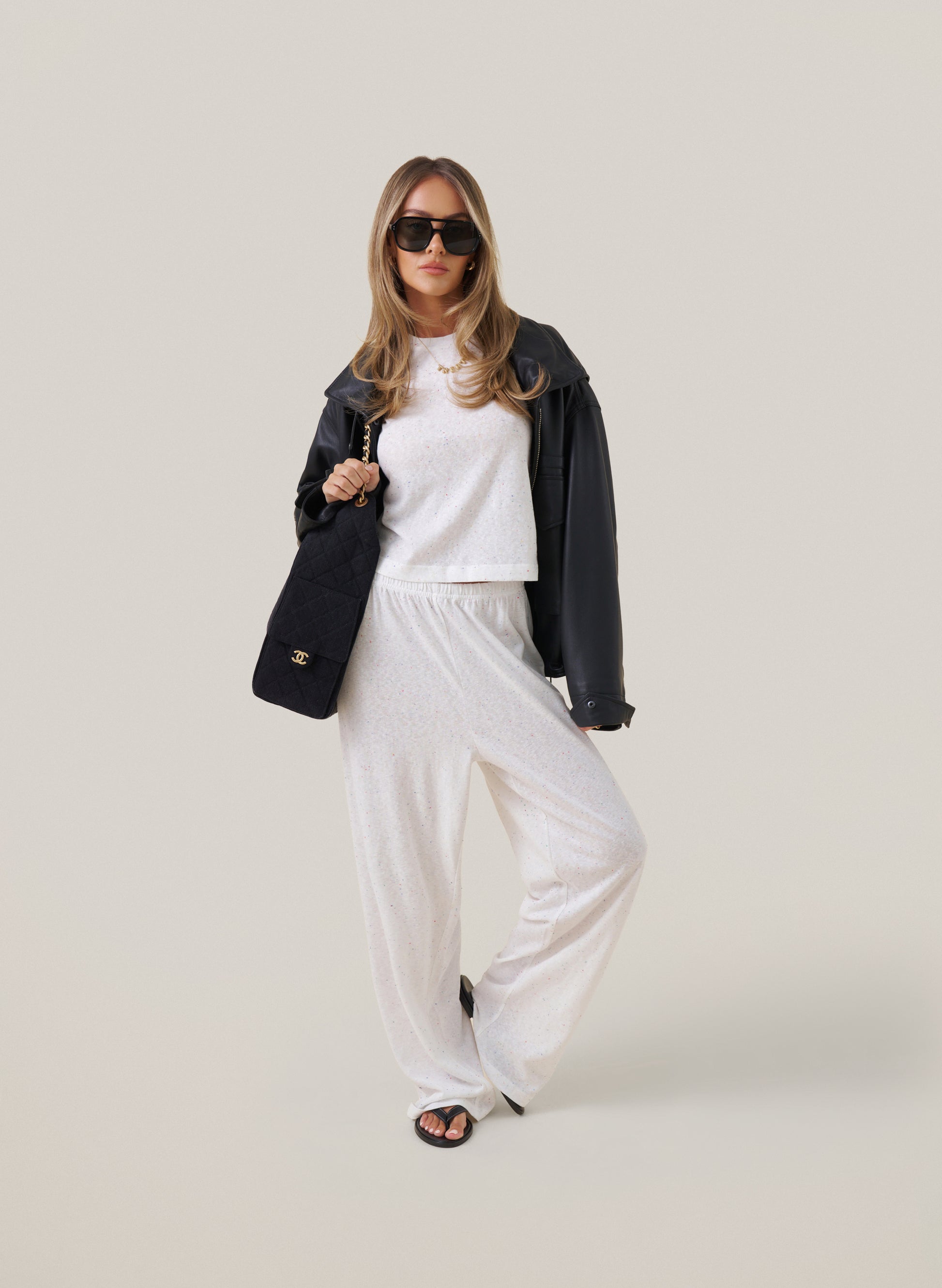 Our Confetti Trouser Set comes in off-white and is flecked with multicolour confetti for a understated pop of colour. Comfy, playful, just add sunshine, good vibes, and your go-to trainers.
