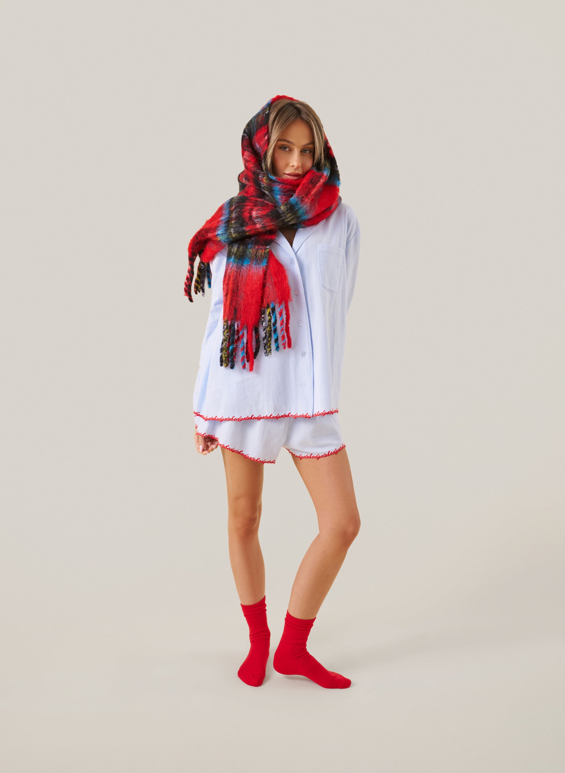 The Go To Bed Pyjamas are a relaxed, oversized fit with embroidered contrast detailing trim and “go to bed” embroidery on the back.