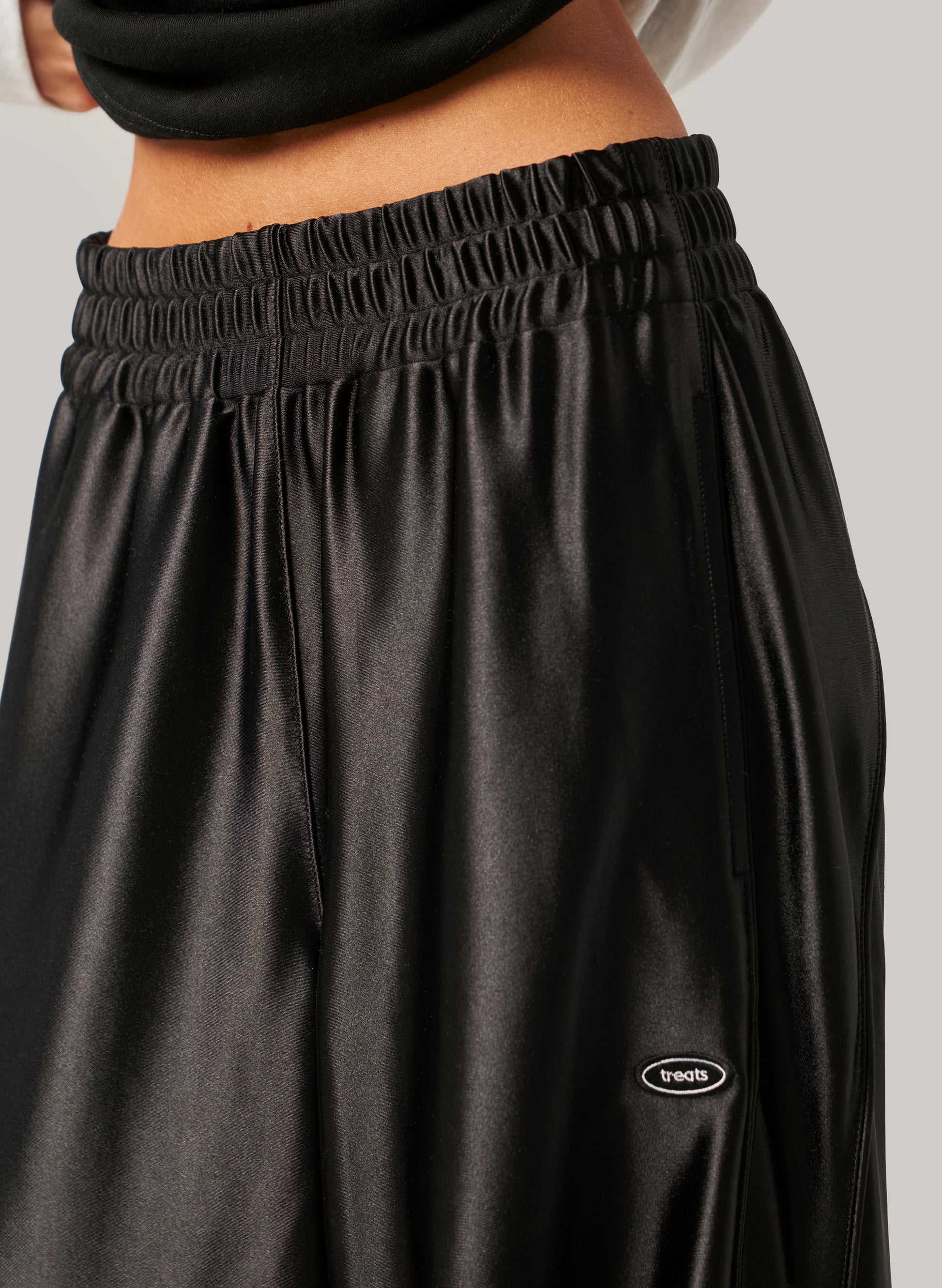 The Lights Out Barrel Pant in black is cut from a fluid satin look material with a relaxed, shaped leg that moves with you. High-shine finish, elasticated waistband.