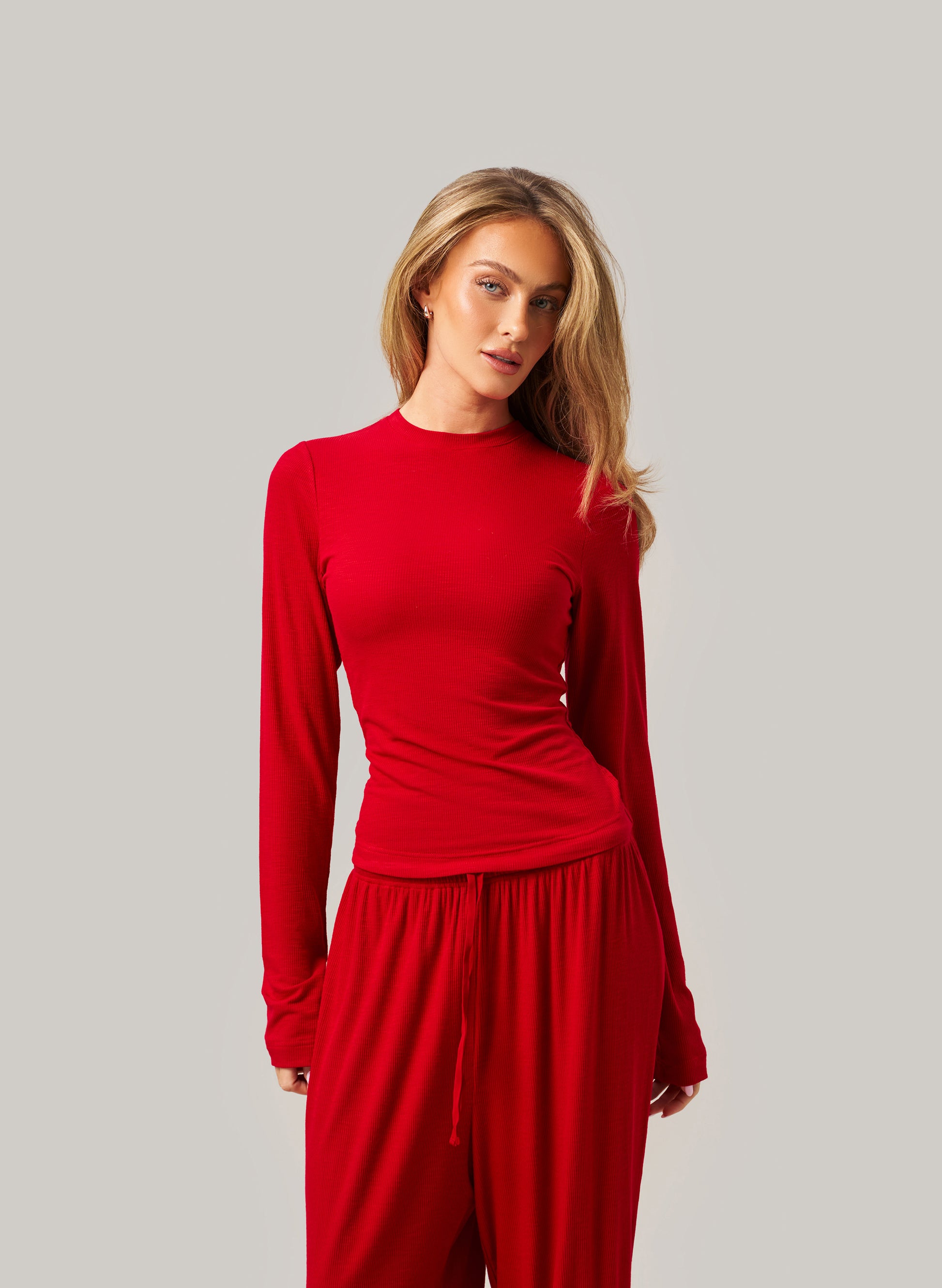The Sculpted Ribbed Set is designed to move seamlessly between moments. Made from a soft, ribbed fabric in red, it features a long-sleeve top with subtle sculpting and matching wide-leg trousers for an effortlessly flattering fit.