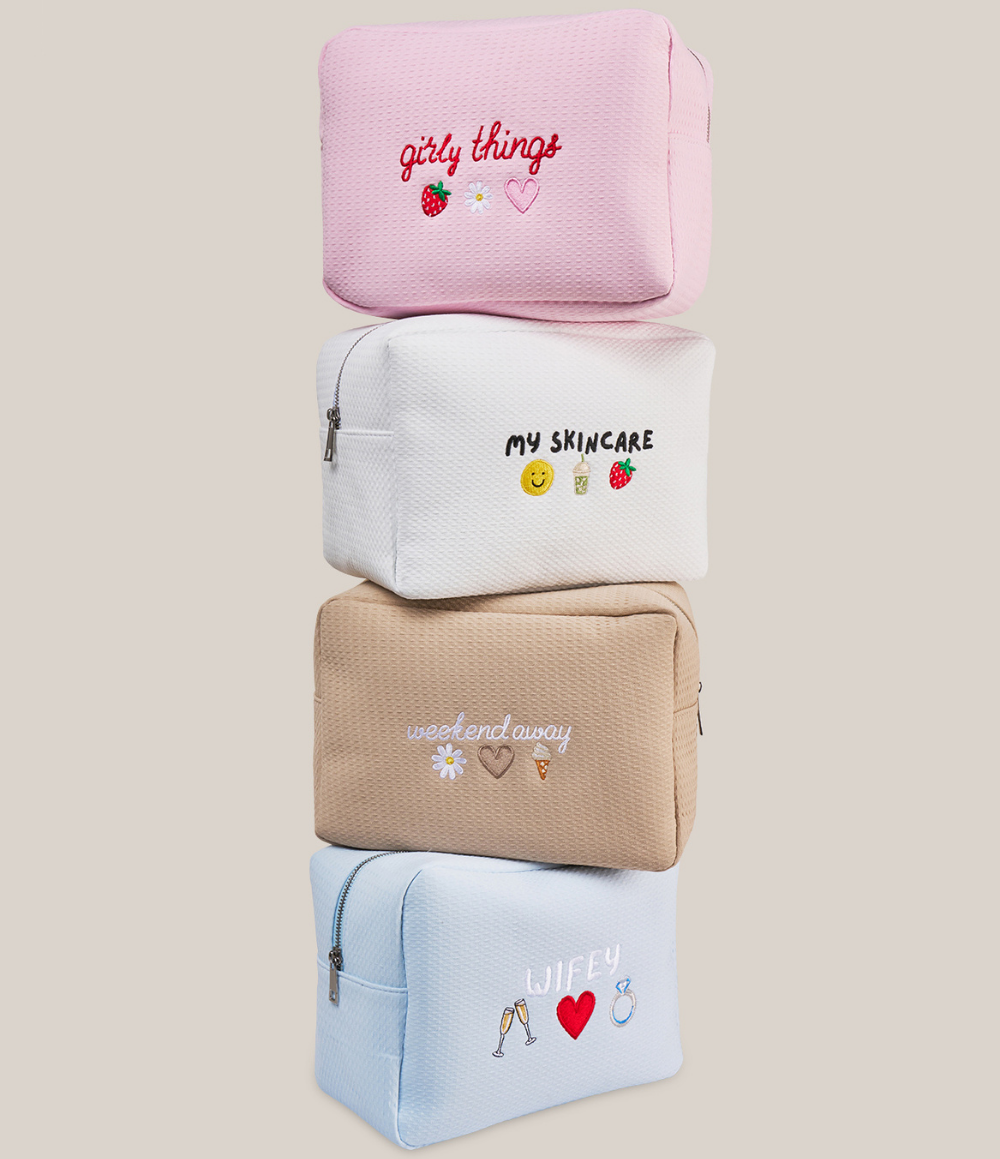 Our Waffle Travel Bag is a versatile everyday essential designed to keep your beauty, skincare or travel items organised. Made from soft, textured waffle fabric with a structured shape, it opens wide for easy access and fits comfortably inside your handbag, carry-on or gym bag.